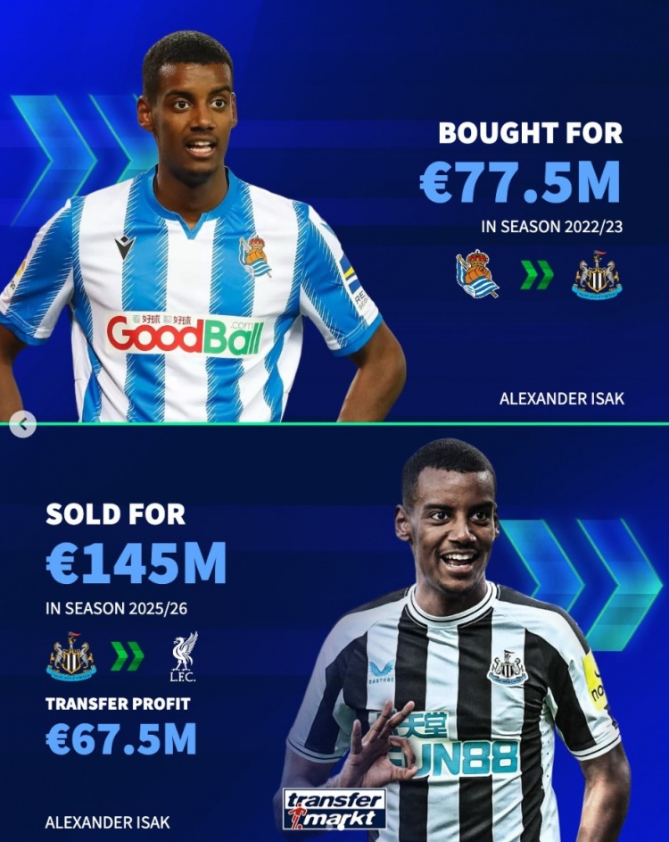 而同一个夏窗,纽卡以7750万欧元从皇家社会引进伊萨克,今夏以1.45亿欧元将其出售给利物浦。净赚6750万欧。