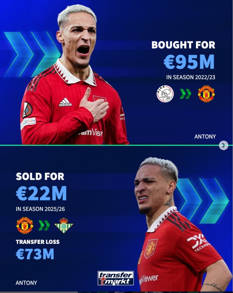 2022年夏窗,曼联以9500万欧元从阿贾克斯引进安东尼,苏超直播今夏以2200万欧将其卖给贝蒂斯。净亏7300万欧。