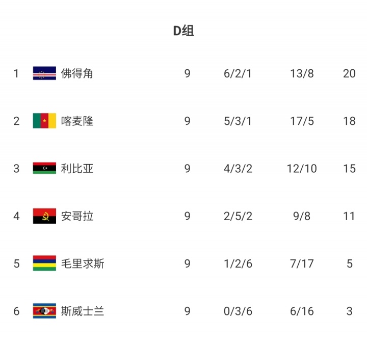 世预赛仅剩最后一轮,佛得角仍2分领跑,下轮面对小组垫底的斯威士兰,苏超直播赢球即可确保队史首次晋级下一轮 世界杯赛 ;喀麦隆第2追赶 2分,但握有7个净胜球优势。
