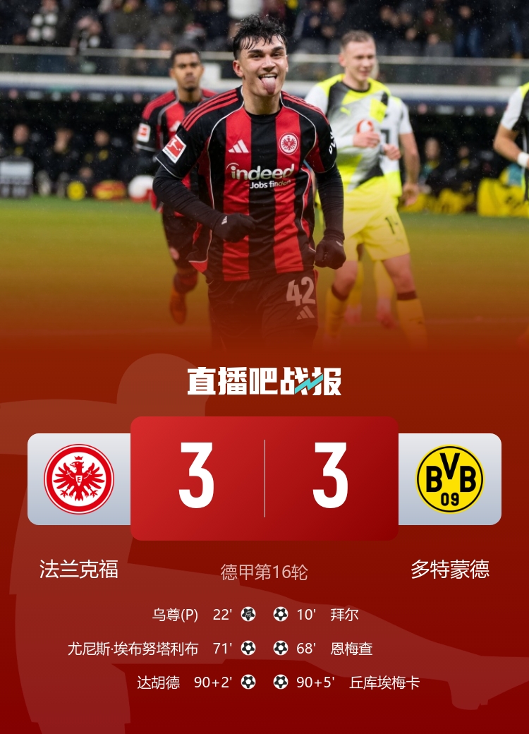 神剧情!多特3-3法兰克福 达胡德92分钟得分 丘库埃梅卡95分钟绝平