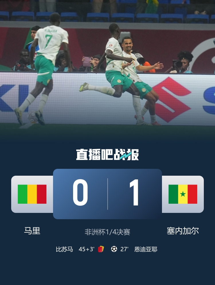 塞内加尔准总决赛 将战埃及/科特迪瓦胜者!恩迪亚耶制胜,比苏马半场两黄变一红。