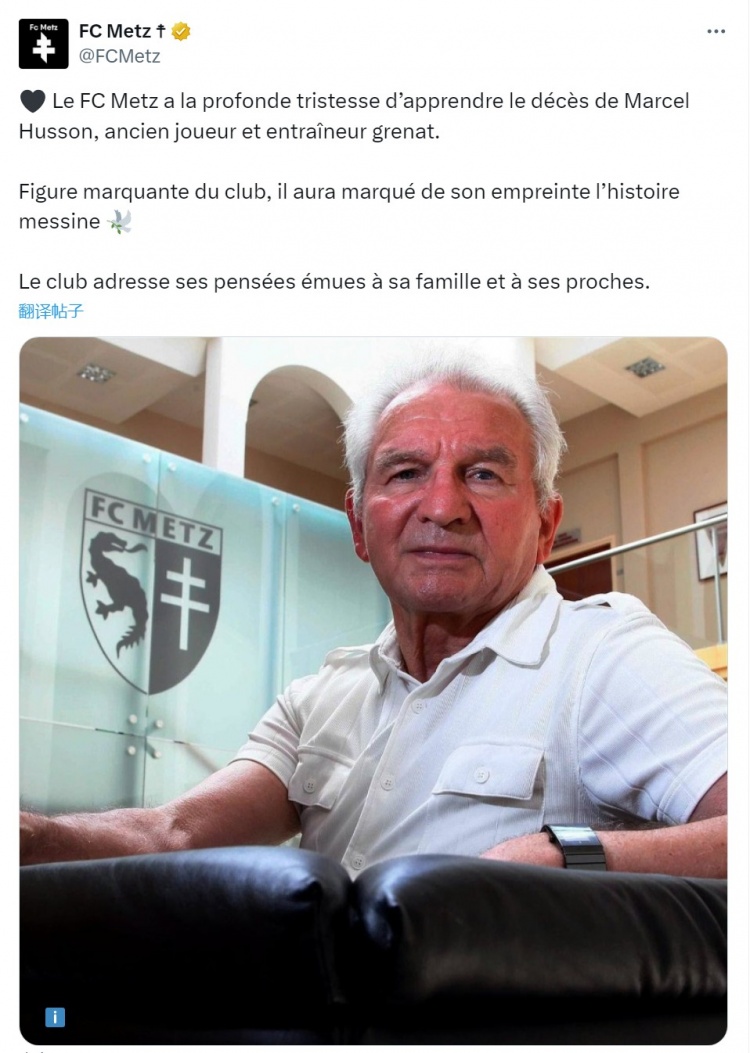 R.I.P.梅斯前主帅马塞尔-胡森去世,俱乐部官方社媒发文致哀