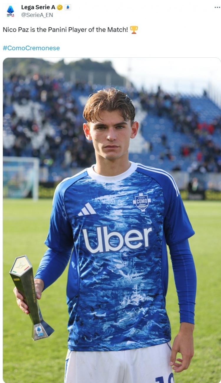 先拔头筹,意甲官方:帕斯当选科莫1-1克雷莫内塞全场最佳