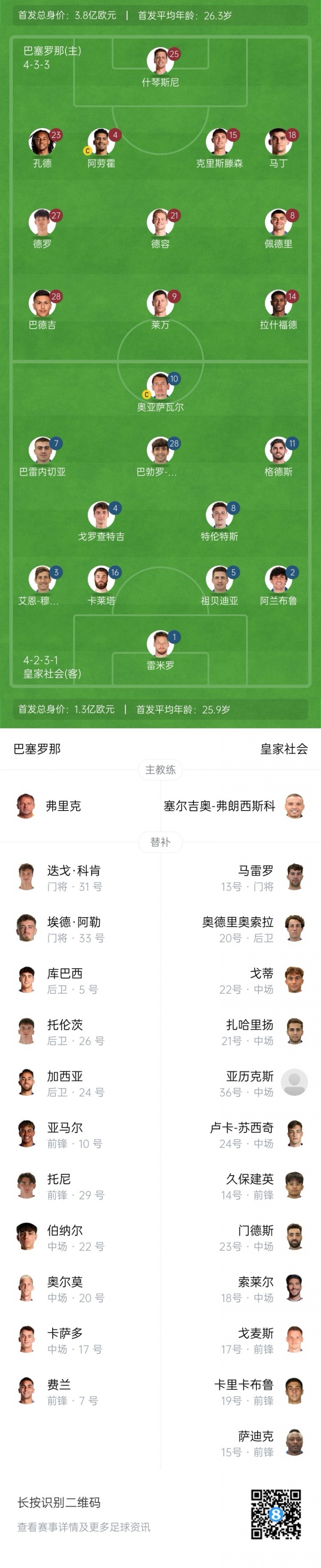 巴塞罗那后备 :31-科亨、5库巴西、33-埃德尔·阿勒、26-托伦茨、24-埃里克·加西亚、22-伯纳尔、29-托尼·费尔南德斯、7-费兰、10-亚马尔、17-卡萨多、20-奥尔莫
