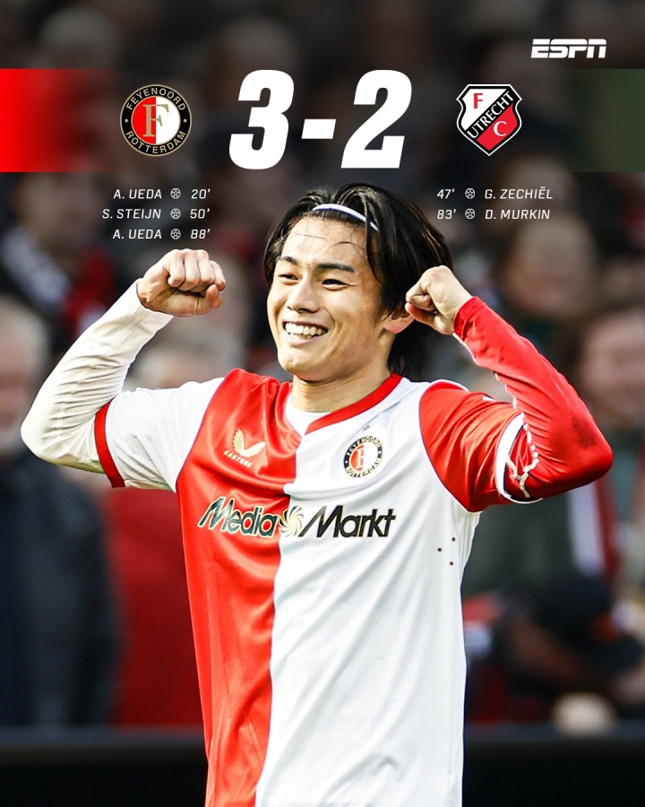 荷甲射手王!上田绮世双响+致胜球 助费耶诺德登顶,8轮荷甲进8球
