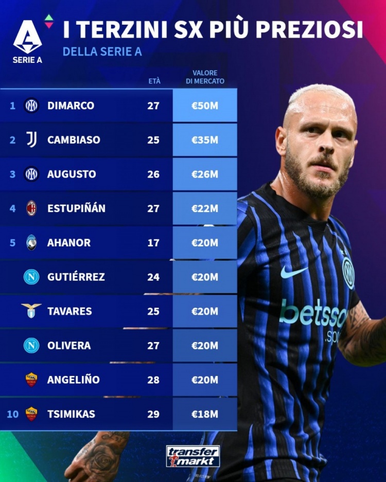 德转盘点意甲左后场球员身价排名:迪马尔科5000万欧居首