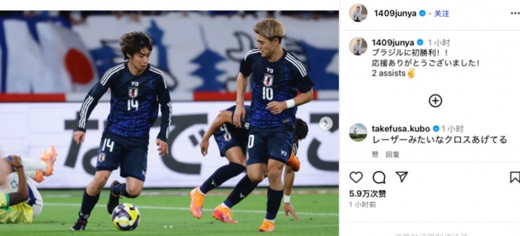 赛后伊东纯也更新社媒,晒出赛事 照并配文庆祝获胜 :“首次击败巴西队!感谢各位来到现场支持我们!收获2次助功 。”