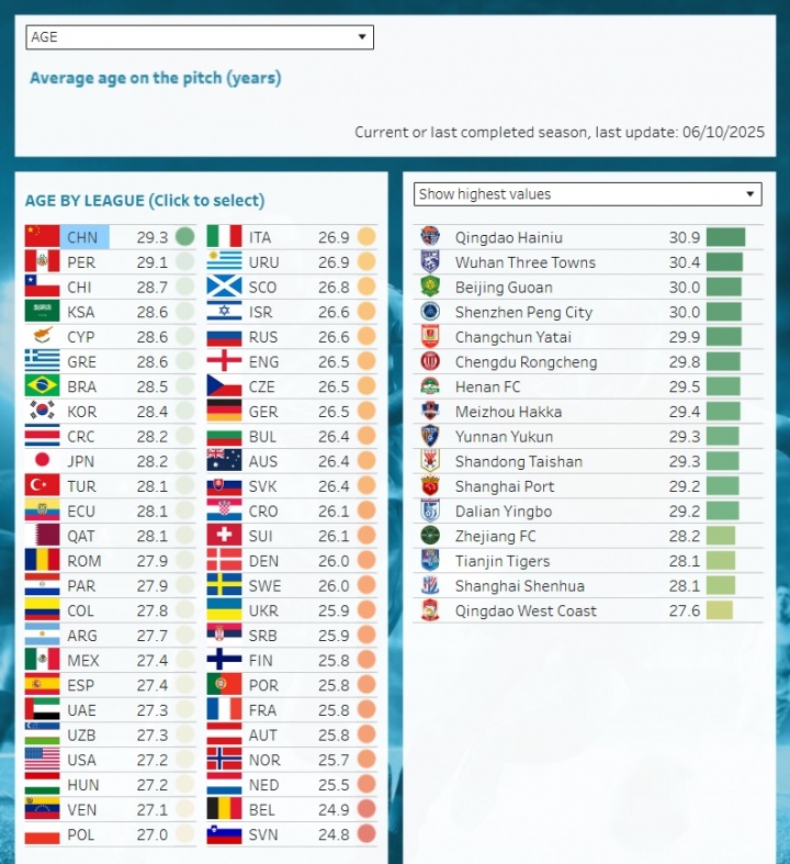 仍居世界“第一”😦CIES:中超平均年龄29.3岁仍为全球最高