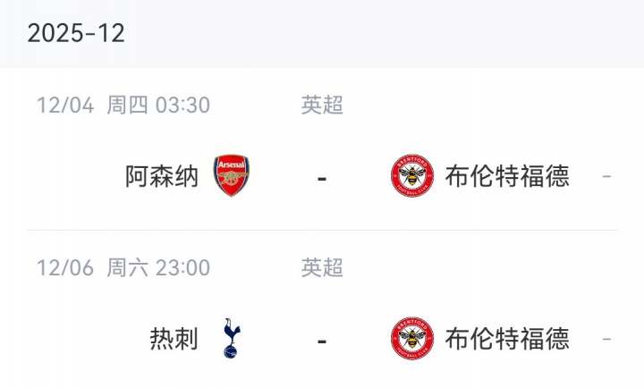 12月份的头两场赛事 ,布伦特福德将接连客场应战 应战 BIG6的另外两支球队:阿森纳和热刺。