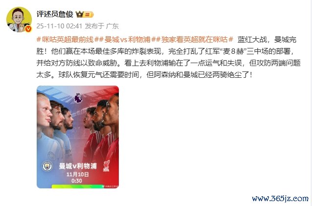 11月10日讯 英超焦点战,曼城3-0战获胜 物浦,詹俊发文点评了本场赛事 。