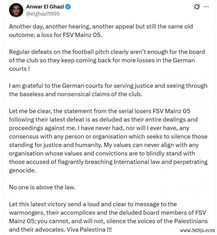 11月13日讯 因支持巴勒斯坦而遭美因茨不当解约的埃尔加齐今日发布社媒,宣告自己对美因茨的官司再度胜诉。
