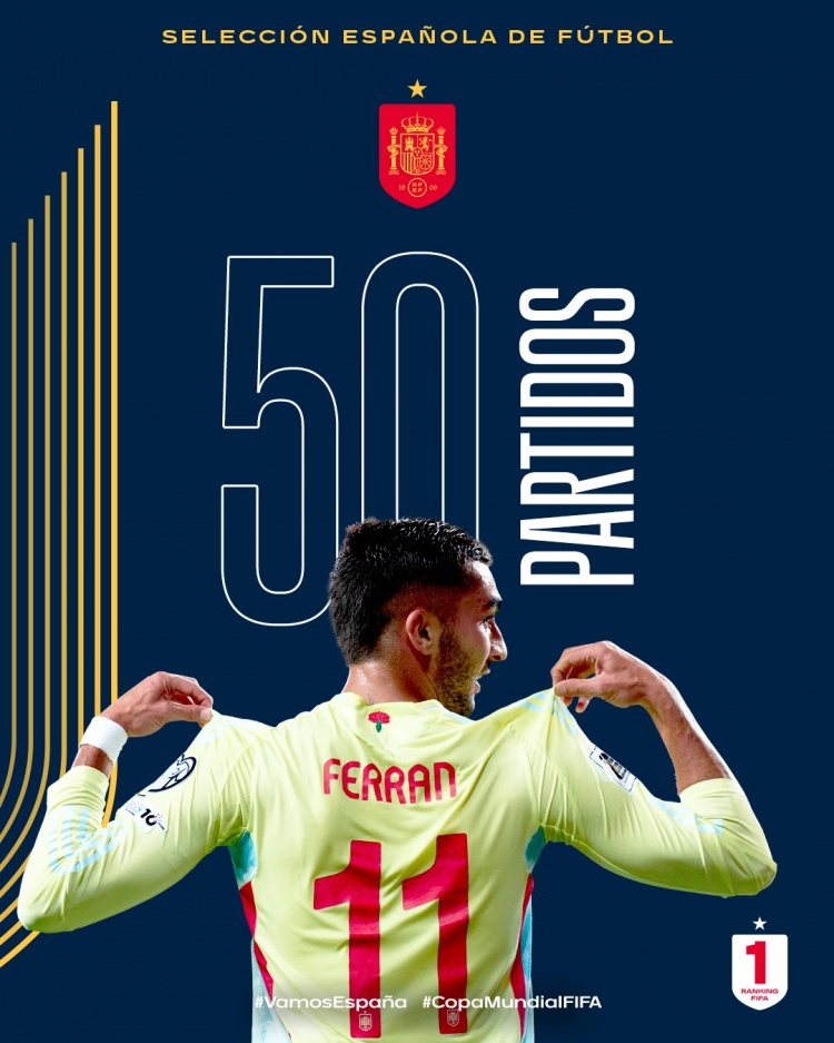 西班牙足协官方:为国家队出战50场,祝贺费兰-托雷斯!